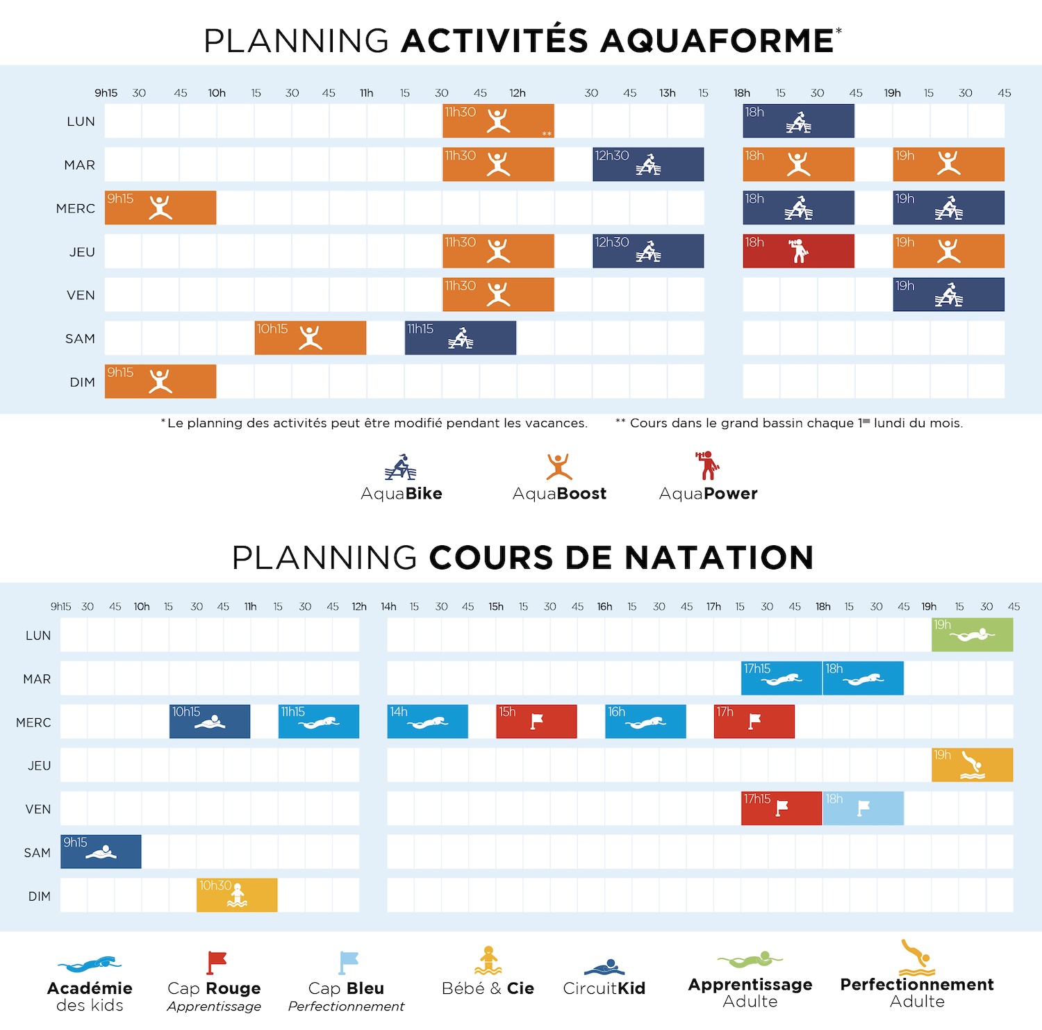 PLANNING ACTIVITÉS ACTIVITÉS ADULTES AQUABIKE AQUA STRETCH AQUA POWER AQUA BOOST AQUAGYM AQUA BOXING ACTIVITÉS ENFANTS BB & Cie CIRCUIT KID ACADÉMIE DES KIDS CAP BLEU CAP ROUGE